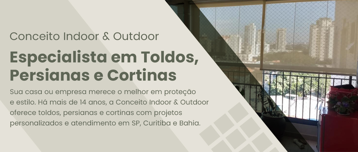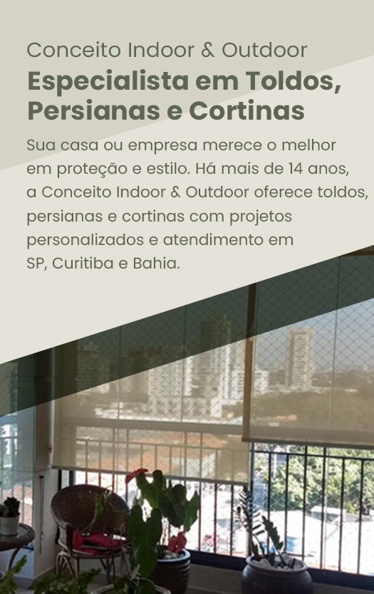 Mais do que proteger, criamos experiências. Na Conceito Indoor & Outdoor, acreditamos que cada ambiente pode contar uma história única. Com 14 anos de atuação, desenvolvemos projetos personalizados em toldos, persianas e cortinas que unem estética, conforto e inovação. Atendemos em São Paulo, Curitiba e Bahia, sempre com carinho, cuidado e excelência.
